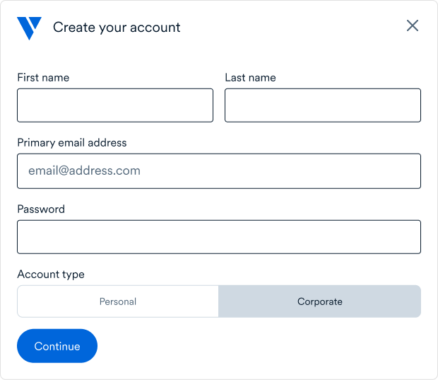 * **Account type:** Designate your account as a [Personal](#personal-accounts) or [Corporate](#corporate-accounts) account type.